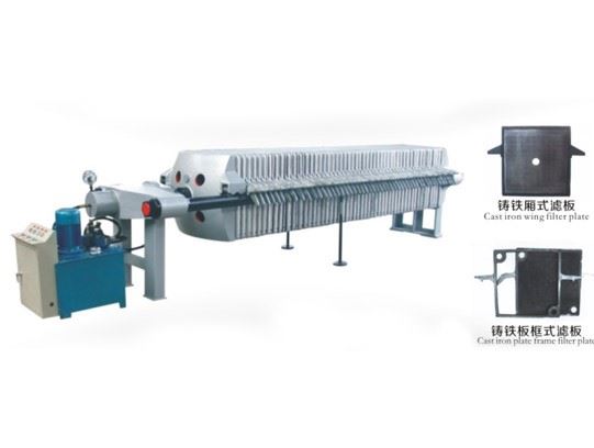 隔膜壓濾機(jī),隔膜壓榨壓濾機(jī)由隔膜板和廂式濾板排列組成濾室,在輸料泵的壓力作用下將漿料輸入濾室,通過過濾介質(zhì)(濾布)將濾料中的固體和液體分離,當(dāng)漿料中的固體形成餅后,再向隔膜通入空氣,對濾室內(nèi)的固體充分壓榨,降低含水率。對于粘性物料的過濾及對含水率要求較高的用戶,此機(jī)更有其獨(dú)特的特性。
